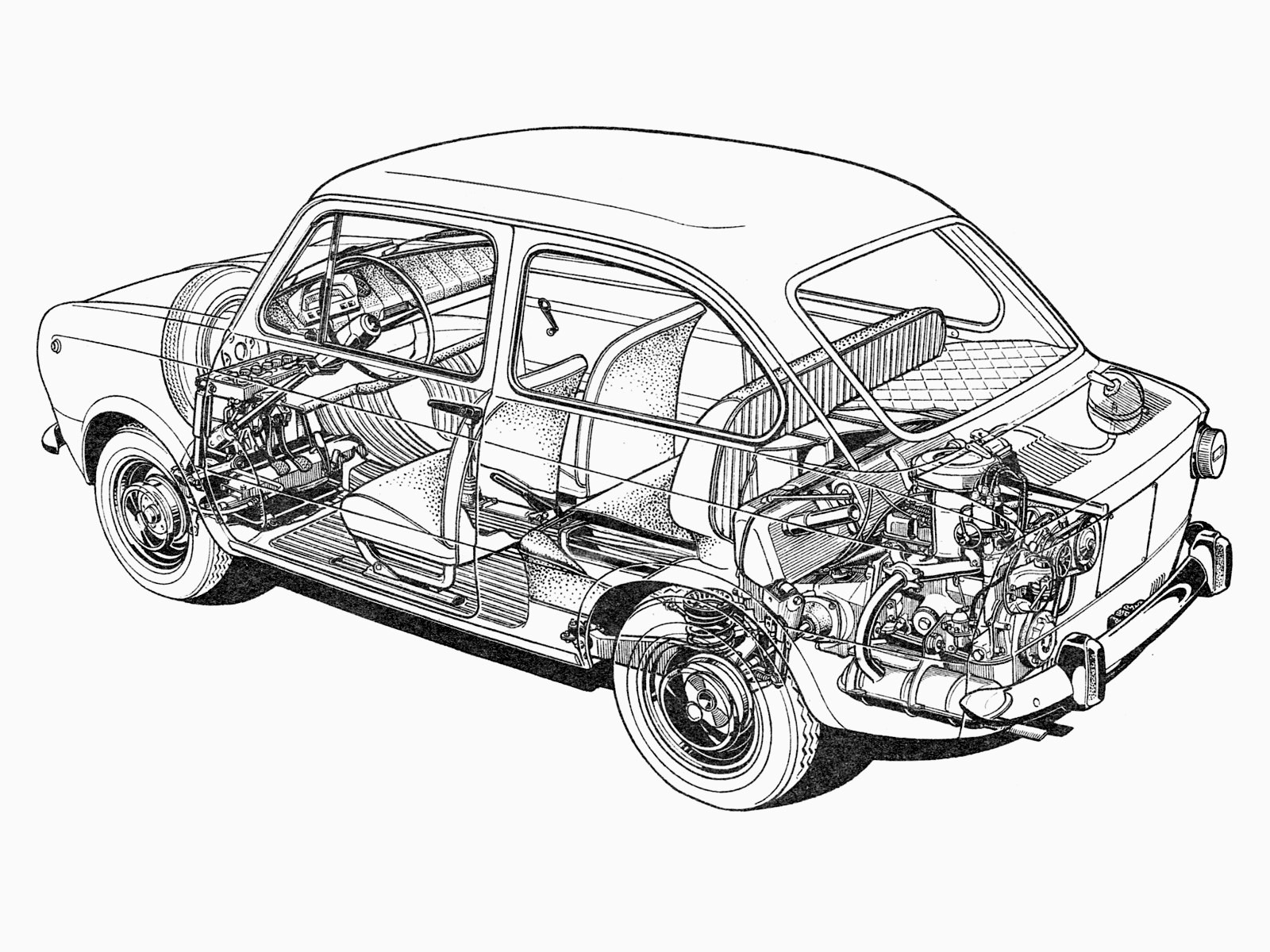 De techniek van de Fiat 850, mooi gefotografeerd door Fiat.