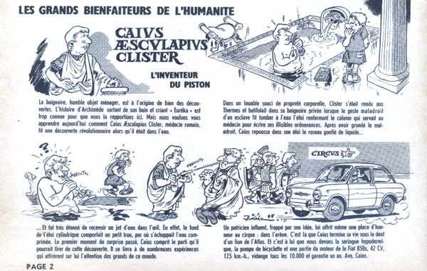 Deze keer over de uitvinder van de zuiger(?), Caius Aesculapius Clister. Waar of niet waar, er komt een Fiat 850 in voor. En dat is voor mij het belangrijkste. De rest van het verhaal is bijzaak. Maar dat het bad (of de douche) een bron kan zijn van inspiratie, daarmee kan ik het dan weer wel eens zijn.