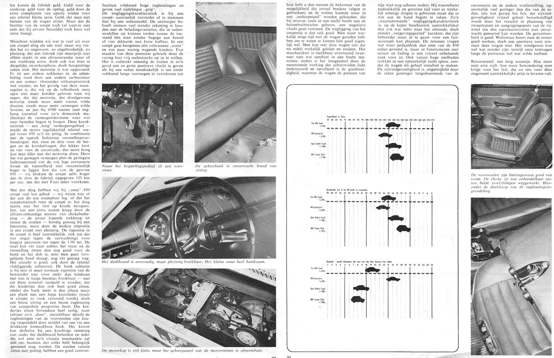In 1965 verscheen er in Autovisie een multitest met daarin, naast de Fiat 850, een Daf, een Simca, een NSU, een Citroën en een Volkswagen. De redacteuren (allemaal mannen!) gaven punten voor diverse belangrijke punten en zo kwam de Fiat 850 op een nipte derde plaats. En om het goed te maken voor de andere helft van de wereld mocht er één vrouw ook nog wat frivole woorden aan wijden.