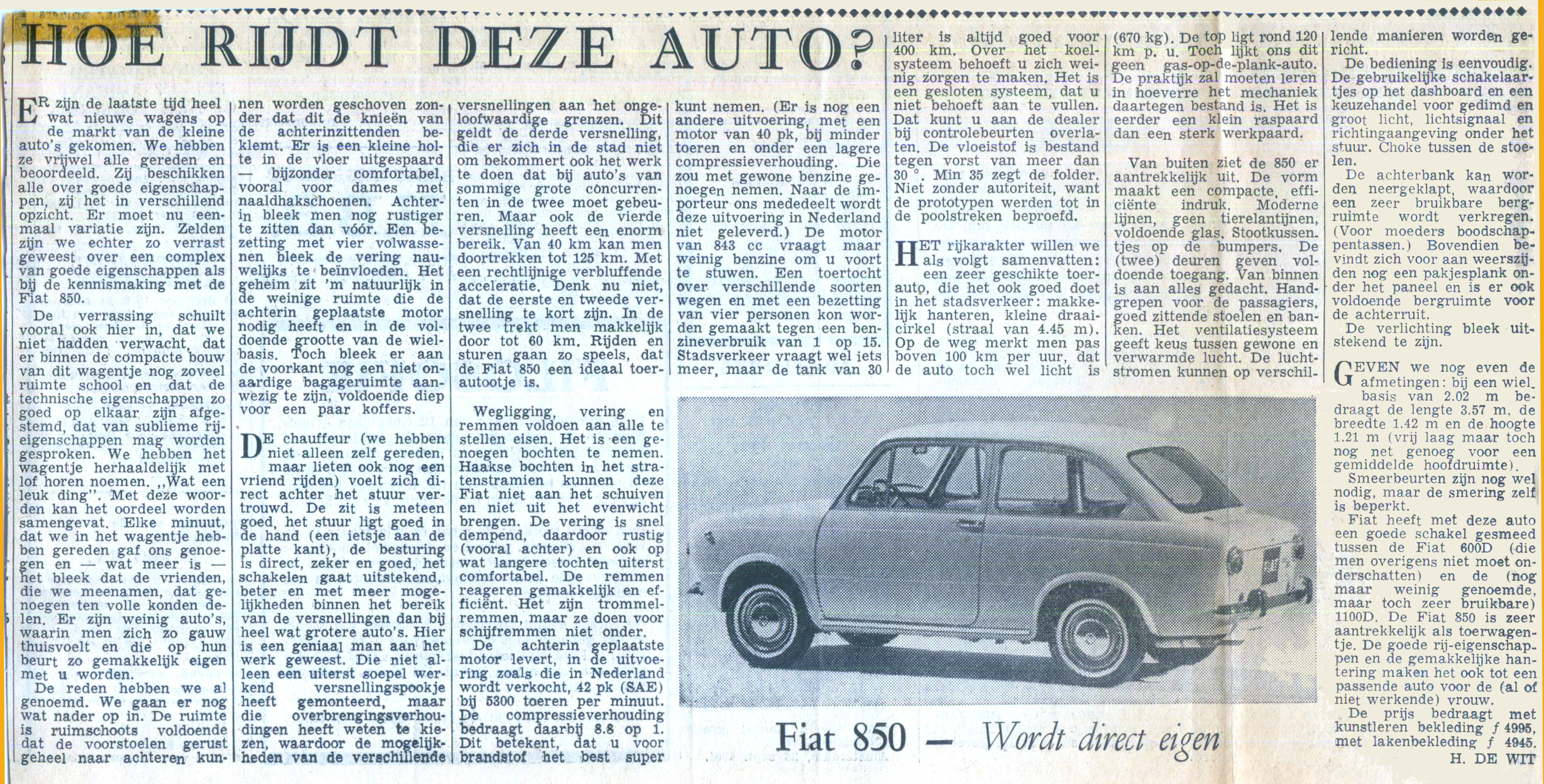 Geen idee uit welke krant dit artikel komt maar aan de conclusie te zien beviel de Fiat 850 goed. Maar dat de 850 door zijn goede rij-eigenschappen en de gemakkelijke hantering een passende auto is voor de (al dan niet) werkende vrouw is niet echt meer van deze tijd.