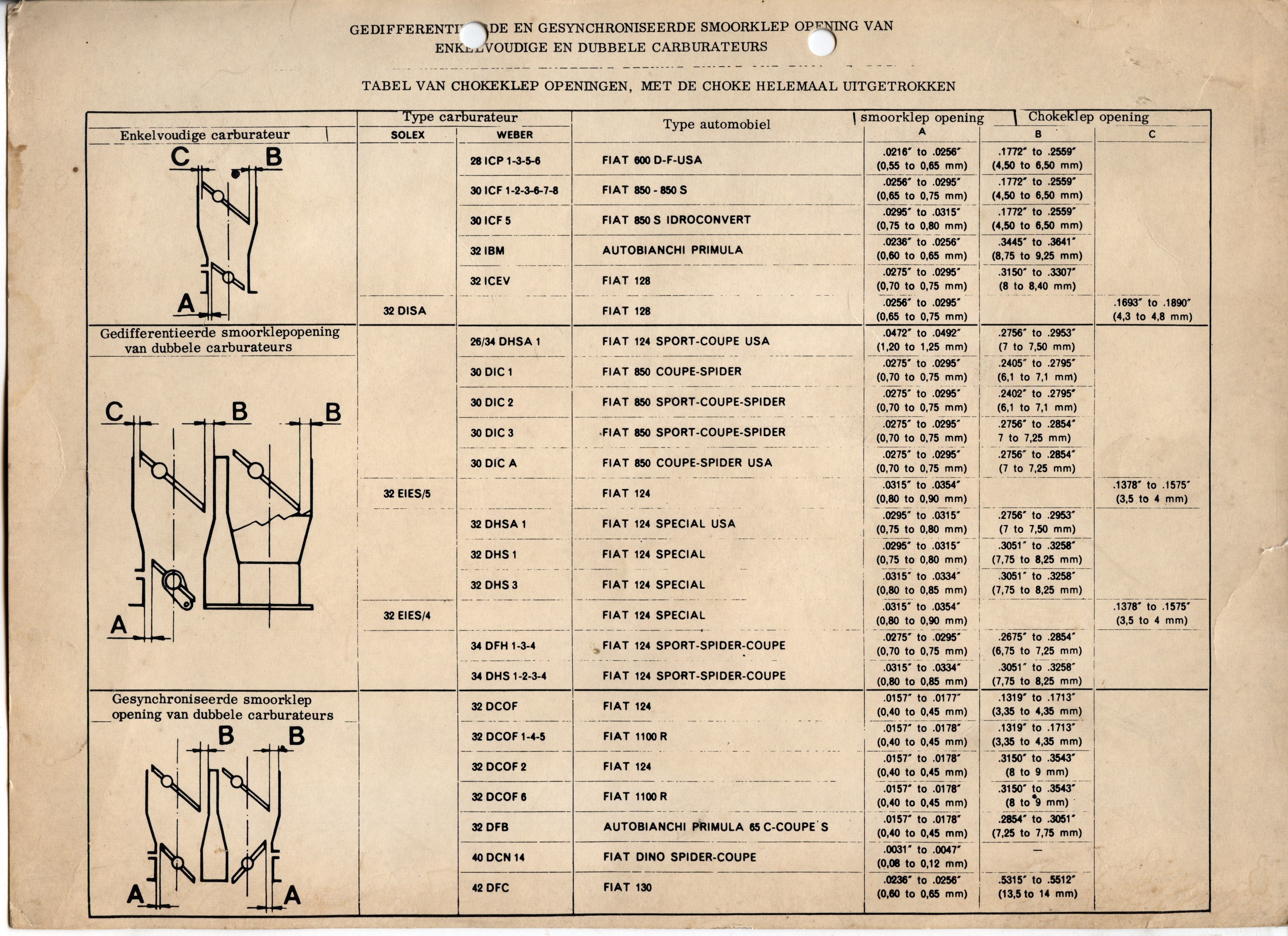 Als je nou ook het laatste beetje van de afstelling van de carburateur van je Fiat 850 100% goed wilt hebben dan kun je even klikken op de afbeelding hieronder. De kans is groot dat je je carburateur er tussen ziet staan. Het is een overzicht dat door de toenmalige importeur aan de dealers werd verstrekt.