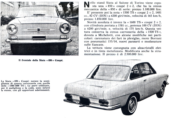 Zijn hoop was gevestigd op het succes van de door Giovanni Michelotti getekende 1500 Coupé. In de zomer van 1964 introduceerde Siata daarom een compactere 2+2 coupé op basis van de Fiat 850, inclusief een snellere TS-versie. Daarover schreef ik een ander artikel dat je kunt vinden in het Siata menu.