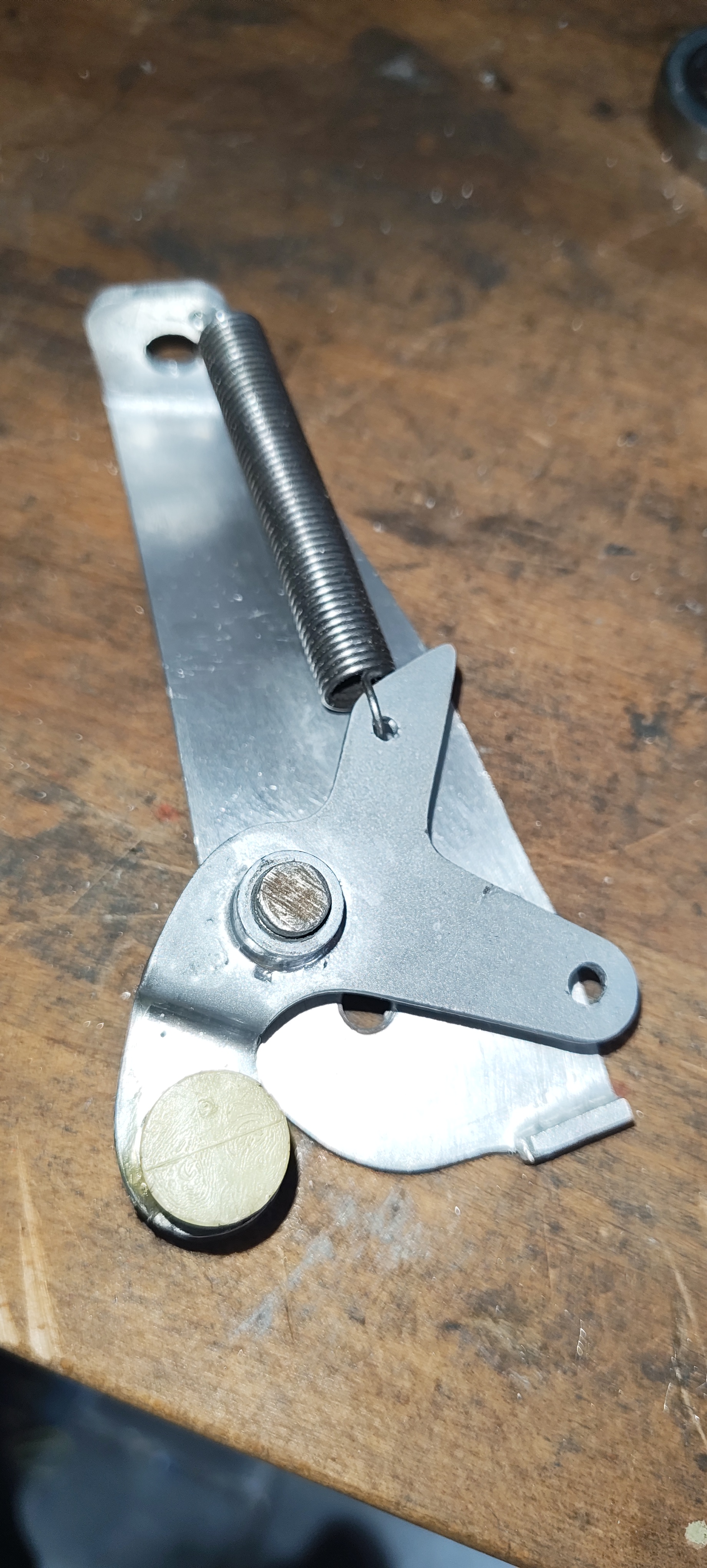 En daarna was het meten, tekenen, zagen, boren en vijlen. De scharnier-as voor het mechanisme was een 8mm tapeind waarvan één stuk draad werd afgezaagd. De groef voor de circlip maakte ik met het tapeind in de kolomboor en een nieuw zaagblad op de juiste plaats er tegen houdend. En waar ik er een klein half jaar over had gedaan om een mechanisme te bedenken was het maken in een paar uur klaar.